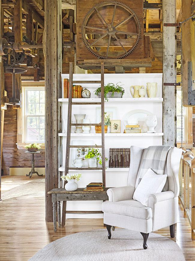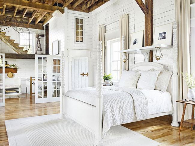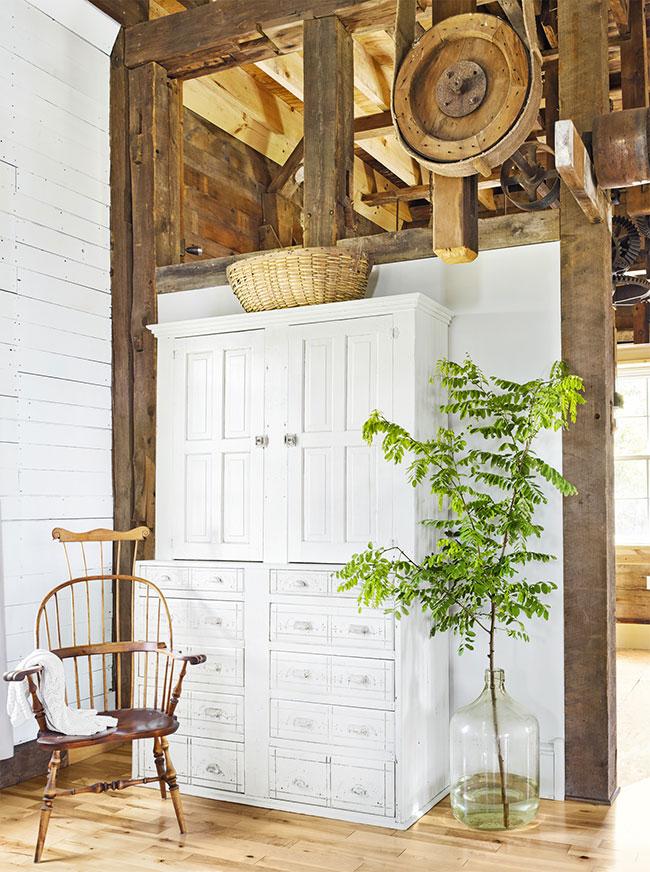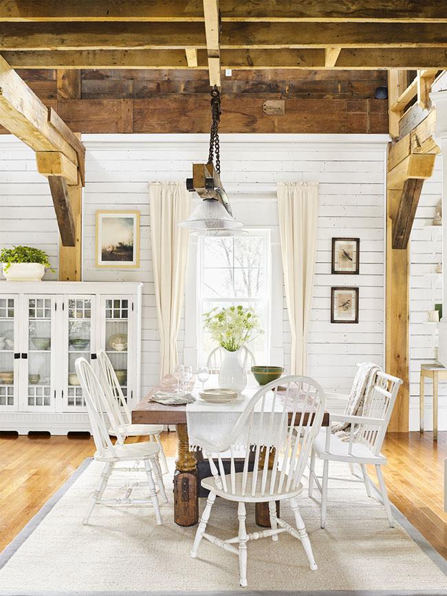 La personalidad de sus dueños, una pareja de anticuarios, se refleja en cada rincón de la casa. Como en el cuadro de la vaca, a la venta en la tienda de su dueña. También prima el reciclaje de piezas de la antigua construcción, como la mesita de café fabricada a partir de una puerta o la lámpara del comedor hecha con cadenas de tractor y poleas. Todo ello arropado por un blanco cálido omnipresente en toda la vivienda, fiel al color original de las paredes. Para no agobiar el espacio y darle protagonismo a los elementos arquitectónicos, se optó por este color en casi todos los muebles, textiles y acabados. Sólo se prescindió de él para complementarlo con acentos de madera natural.