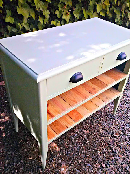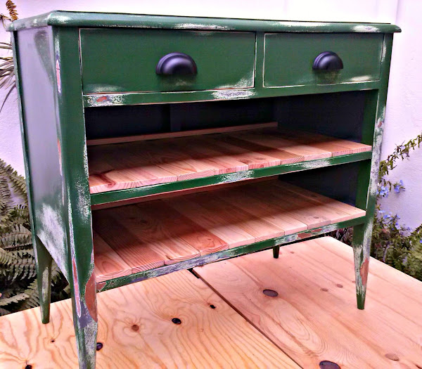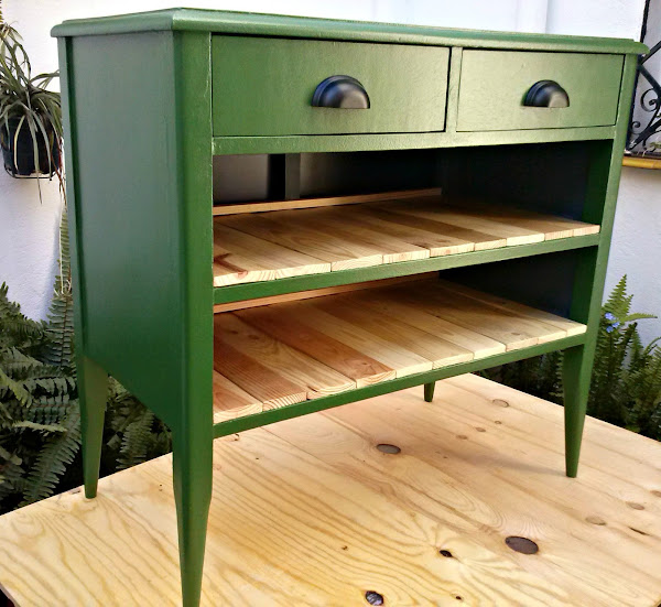 Así que me puse manos a la obra con la cómoda de la fotografía de arriba, la cual ya recuperé y quedó de esta forma, y comencé a transformarla por segunda vez. En esta ocasión el trabajo fue algo más fácil porque ya la parte difícil (anticarcoma, lijado e imprimación) la tenía hecha de la vez anterior, así que lo primero que hice fue quitar los cajones y preparar las maderas para hacer las baldas. Mientras sesecaba el barniz de las maderas pinté la cómoda en un verde mint (sin quitar el gris que ya tenía), no por gusto sino para ir preparando la cómoda para cuando le fuera a dar el efecto desgastado. Ya con todo seco comencé a aplicar la pintura verde oscuro para su acabado final y después de dos capas y sus correspondientes horas de secado comencé a darle el efecto desgastado. Como debajo del verde oscuro estaban el verde mint y el gris, cuando comencé a lijar los bordes iban apareciendo estos último y el resultado quedaba en tres colores distintos, como de un mueble antiguo al cual le han dado varias manos de pintura durante muchos años. En las últimas fotos podéis verlo muy bien, ya sabéis que las fotos son mi asignatura pendiente pero se ve bien el efecto que os digo.