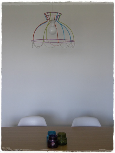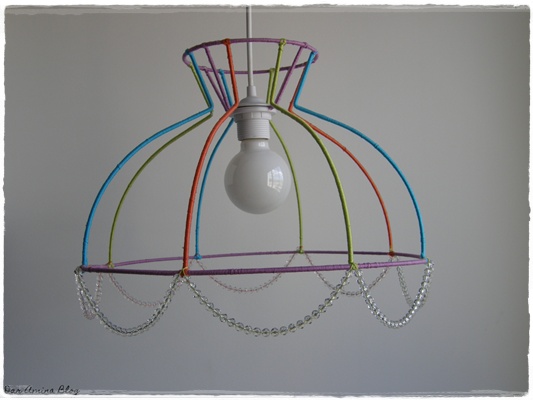 Esta vez, y para comenzar, hemos diseñado una lámpara. Basta con la estructura de una pantalla de tela que tenga cierta originalidad para crear e improvisar. Si le sumamos que el día que compré los hilos tenía mucha vitalidad, el resultado es una lámpara muy muy llamativa. Además, el punto final lo ponen los cristalitos de strass que le dan un toque muy chic.