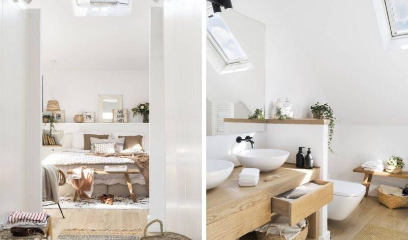 La decoración y los acabados blancos contrastan con el suelo de madera maciza, que se complementa a la perfección con los delicados textiles en tonos rosados y marrones.