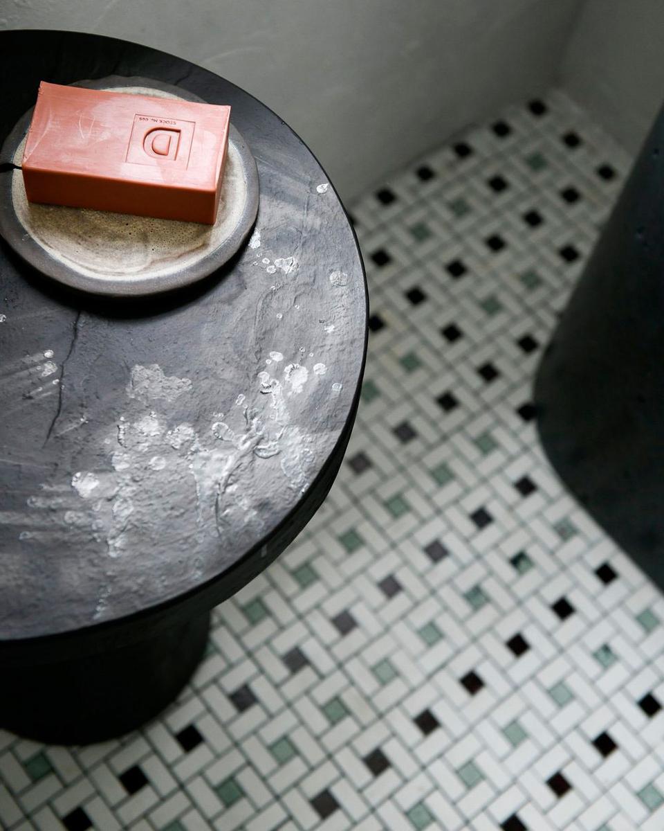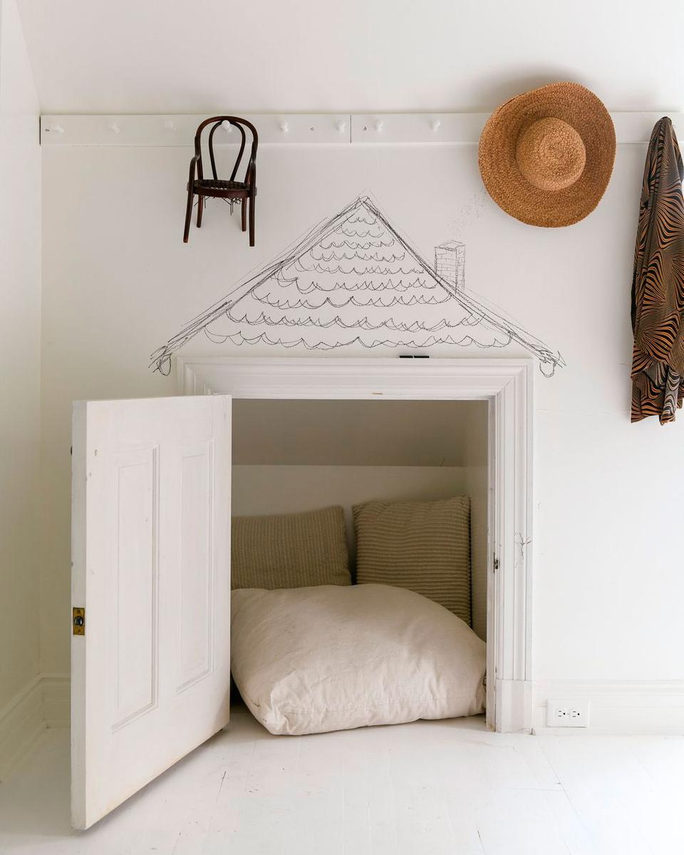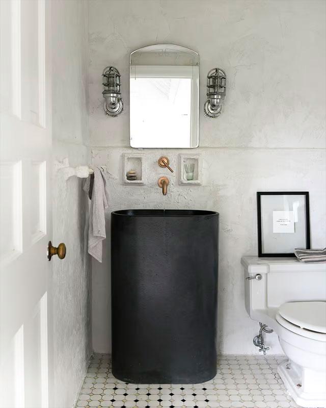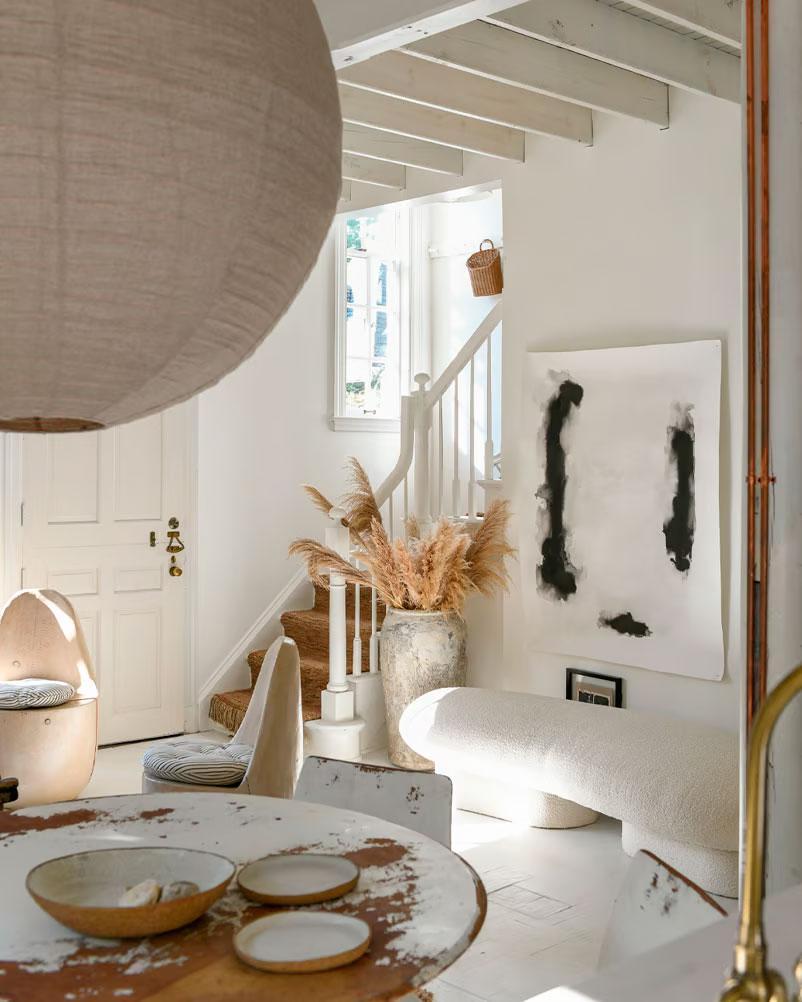En este nuevo espacio carente de color, lo que llama la atención es el mobiliario, las texturas y la creación de rincones cuanto menos singulares. Me encanta la mesa camilla con la silla tipo Thonet del dormitorio principal, o el espacio bajo la escalera donde la interiorista ha creado un lugar de refugio que simula una pequeña casita, para su hija. También el precioso lavabo de pedestal negro del cuarto de baño, es de Noodco, y cómo se han revestido las paredes tapando el azulejo con un micro cemento de Surecrete Design que le otorga textura. El comedor es otra de mis zonas favoritas, mesa y sillas de Eneby Home, así como el banco tapizado con tela Bouclé de la entrada, de Crate & Barrel.