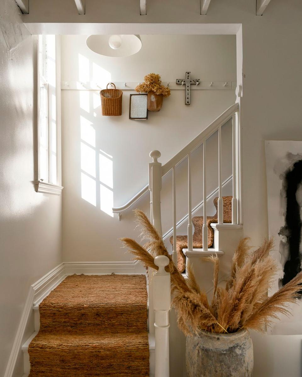 Para unificar todo el conjunto, la interiorista pintó las paredes, el techo y las molduras en Blanco Natural de la firma Behr, dándole ligereza al espacio. Para vestir el suelo de las escaleras se le ocurrió comprar alfombras de sisal y graparlas al suelo, una forma original y más económica que hacer una moqueta a medida.