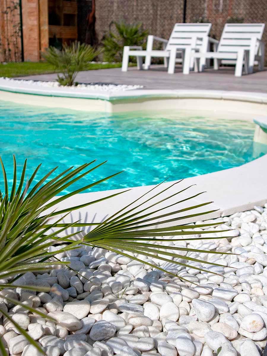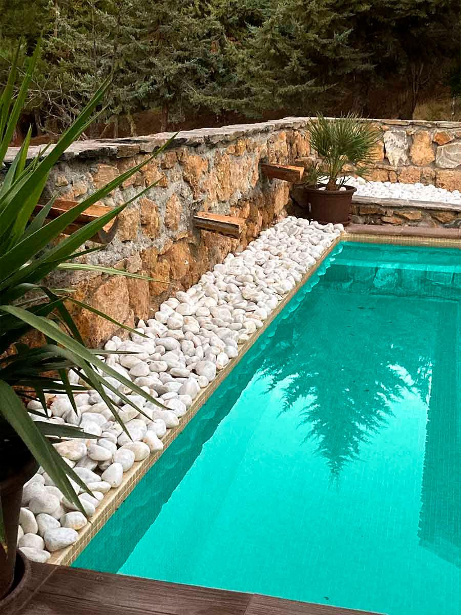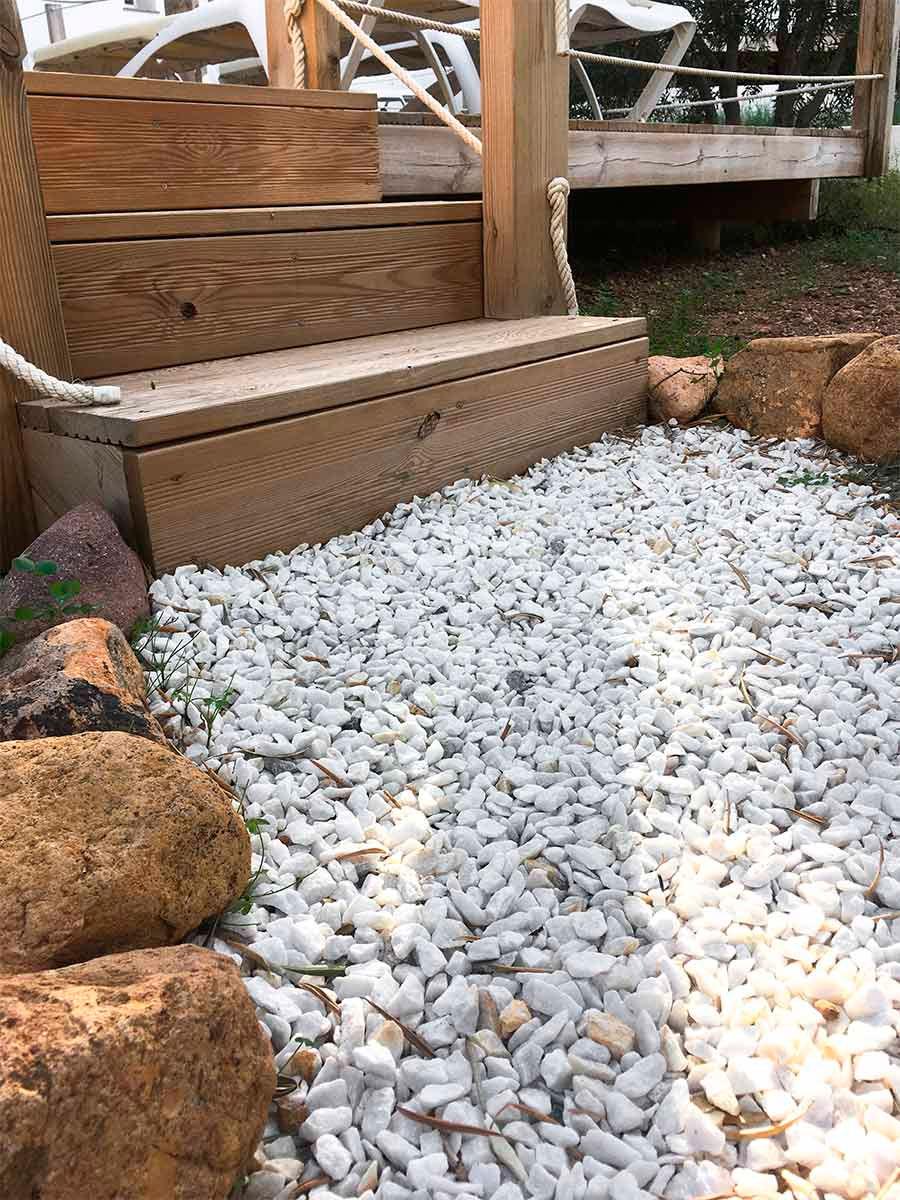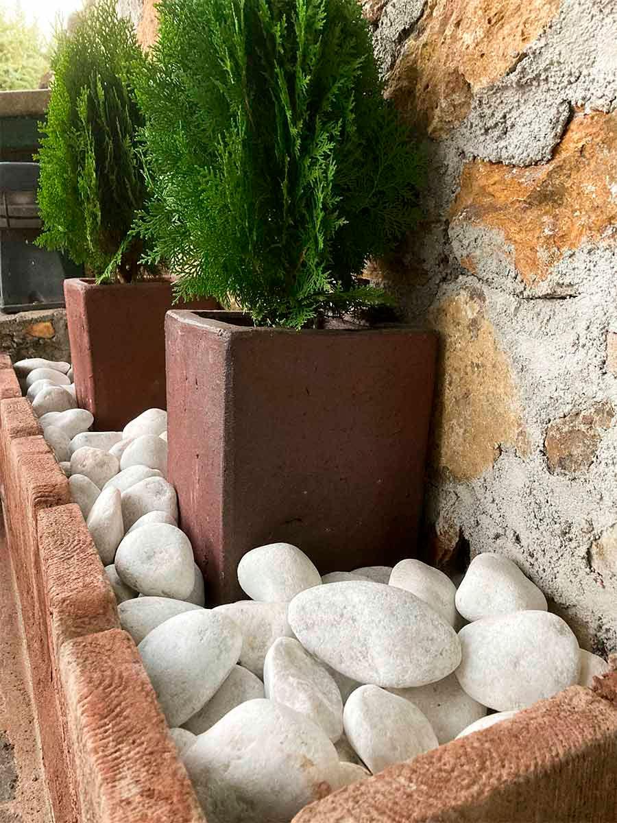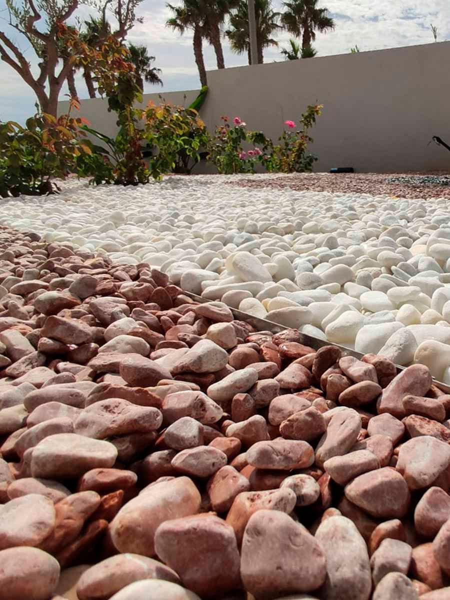 Los cantos rodados, algo más voluminosos, además de darte la posibilidad de decorar, son perfectos para un buen drenaje del terreno. Quizás los blancos son los que tenéis más vistos, pero existen multitud de colores y formas de tal manera, que se adaptan perfectamente a la estética que queramos dar a nuestro jardín (el rojo mármol y el de pizarra Negra me parecen espectaculares).
