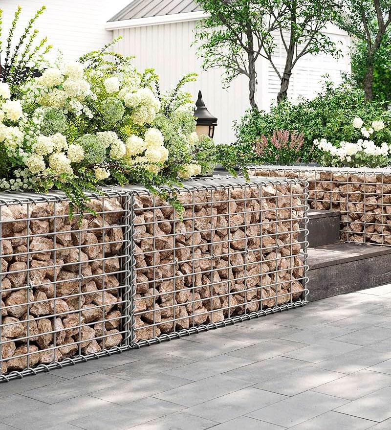 Tanto las Rocallas como los Bolos decorativos, son perfectos para combinar con los Gaviones. Éstos, son estructuras metálicas de hierro galvanizado o acero inoxidable a modo de contenedores donde se introducen dichas rocallas o bolos decorativos creando bonitas estructuras, ya sea a modo de separación de ambientes, para construcción de muros o para delimitar grandes jardineras.