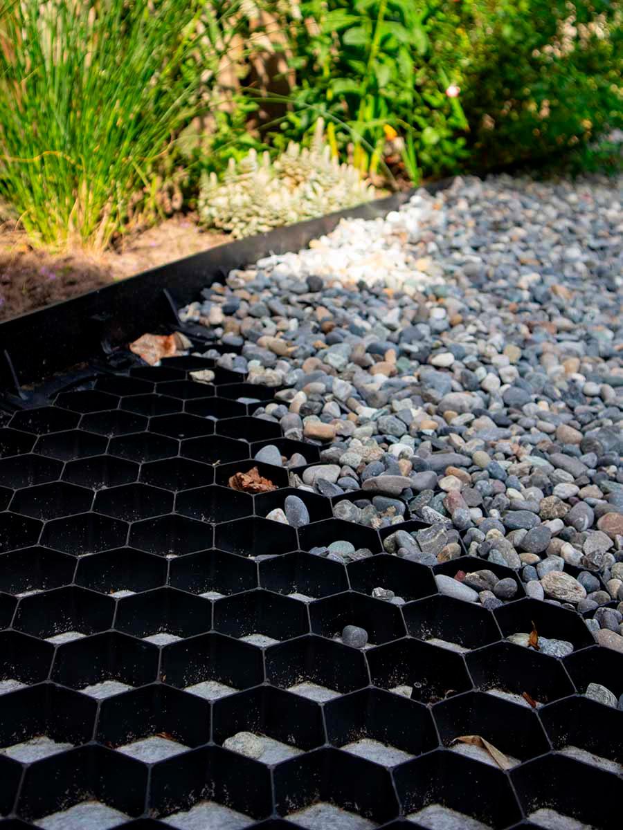 Empezamos con la grava y los cantos rodados. Los primeros son piedras con forma angular de unos 2 a 60 cm, perfectos para crear caminos, parterres o simplemente decorar, ya sean suelos, macetas o jardineras. En el caso de que queramos cubrir suelos, a veces podemos necesitar estabilizadores o geoceldas para zonas de alto tránsito, aunque no son imprescindibles. Se colocarían bajo la grava o los cantos rodados para impedir que estos se muevan, bien con la pisada, al paso de una bicicleta e incluso de un vehículo. Pero insisto que no son obligatorios, sólo si queremos crear una superficie muy estable.