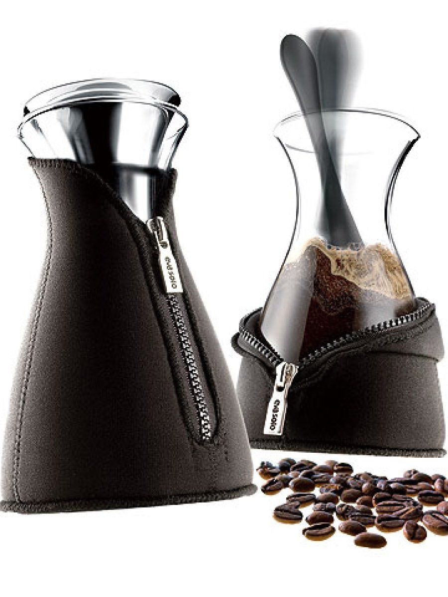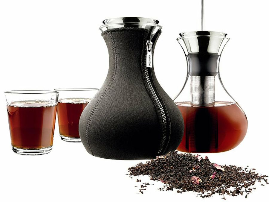 Esta sorprendente tetera es un diseño de Claus Jensen y Henrik Holbaek para Eva Solo en la que podrás hacer té e infusiones en un original recipiente. Forrada con fundas de neopreno lo conservarás caliente hasta servirlo y no te quemarás al cogerla. Su botella de cristal tiene capacidad de hasta un litro y entre sus ingeniosas soluciones destaca su tapón, que se abre automáticamente al servir el té, y su vertidor antigoteo.