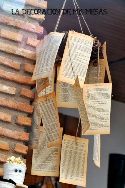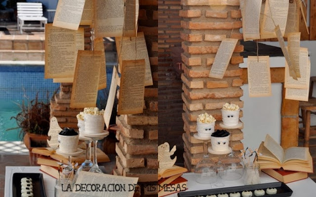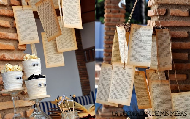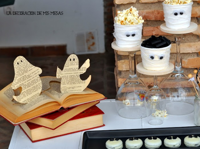 En casa, siempre tengo libros viejos que, en su momento, tuve que sacar de la biblioteca por falta de espacio (ahora con los ebooks ya no pasará esto). Los guardo en cajas para estas ocasiones. En uno de ellos, dibujé unos fantasmas que recorté después y sobresalen del libro a modo de pop-up y es excelente para la mesa de Halloween.
