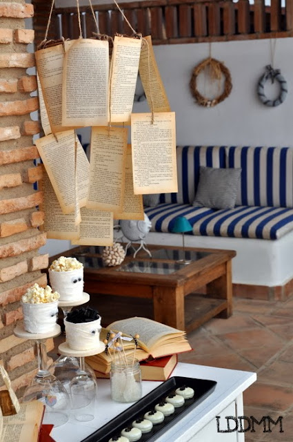 Rematando esta decoración, hicimos una corona colgante de paginas de libros viejos.