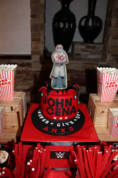La tarta era de chocolate y crema de mascarpone con chocolate blanco. Escogí el diseño que pareciese una explosión porque me gusta el volumen que le da el fondant. El muñeco de John Cena, era con papel de azúcar y galleta de mantequilla, a las que le he puesto dos palitos de helado para que se sujetase en la tarta.