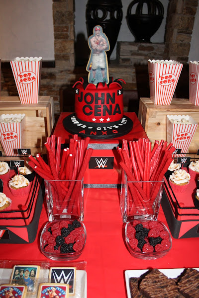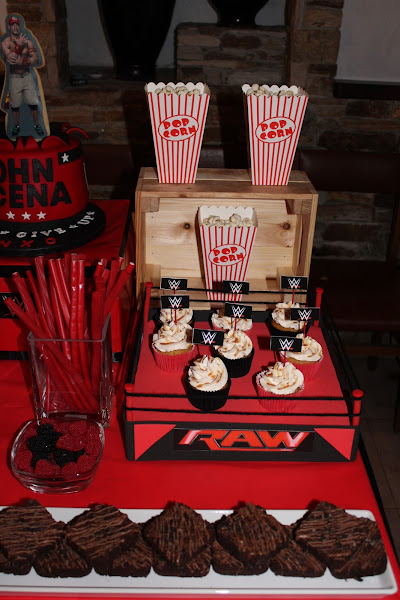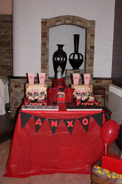 Las gamas cromáticas son muy importantes para que todo en conjunto se vea armonioso y conjuntado. Al igual que los recipientes y stands usados, en mi caso, he hecho unos stands para cupcakes con porexpan y goma eva, que son como el ring de las peleas de la WWE. Esto está todo hecho a mano y personalizado. Al igual que las banderillas con el nombre del niño. Me encantan las manualidades y como sacarle partido para personalizar mis mesas dulces.