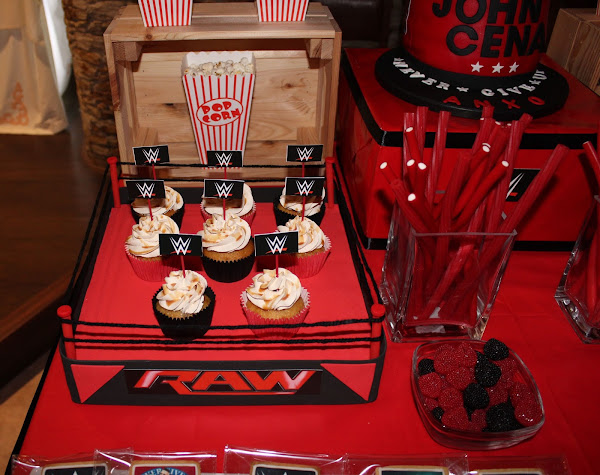 En cuanto a los dulces, hay cupcakes de toffee, un bizcocho esponjoso de caramelo, con chips de caramelo y un suave crema de nata vegetal con toffee casero. Para las banderillas, he ido a la imprenta para que me hiciesen unas copias del logo de WWE y pegué cada dos a un palillo de plástico.