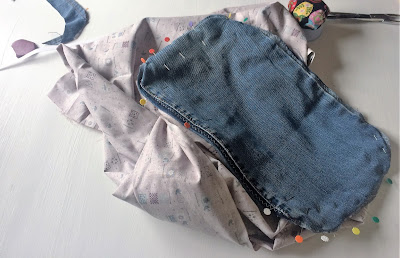 Cosí la costura a la maquina y puse con alfileres a la base de tela vaquera. Después pase a la maquina esta costura.
