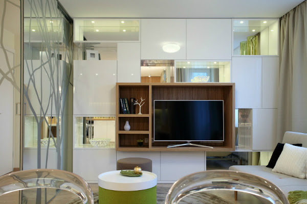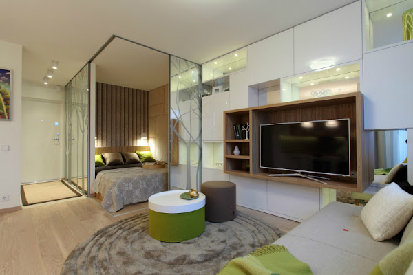 Hoy te quiero mostrar un miniapartamento en el que si hay se puede destacar sin fijarse mucho en los detalles es la funcionalidad a pesar de sus escasos metros. Una vivienda con almacenaje oculto por cada rincón pero sin parecer que todo esta metido en una caja agolpado. Se respeta cada centímetro, distancia donde no caben agobios y puedes estar relajado en cada espacio ya que se marca cuales son las diferentes zonas. Grandes ideas, como la pared de cristal con un vinilo que atrae a la naturaleza y a la vez consigue luz dentro del dormitorio pero intimidad con el resto de la casa, detalle que es una gran idea en cuanto a los espacio pequeños. Todo es un espacio abierto pero la sensación de comodidad tan importante que es en un hogar, este miniapartamento lo cumple 100%.