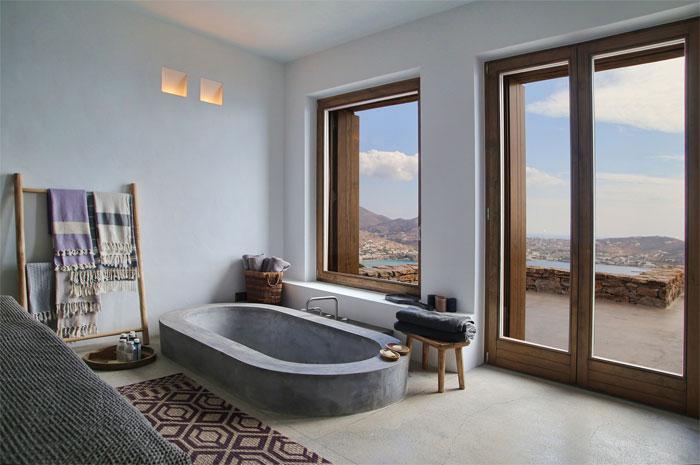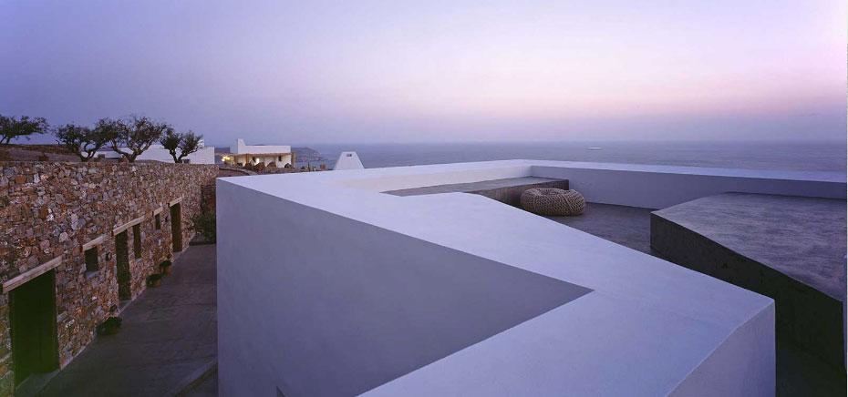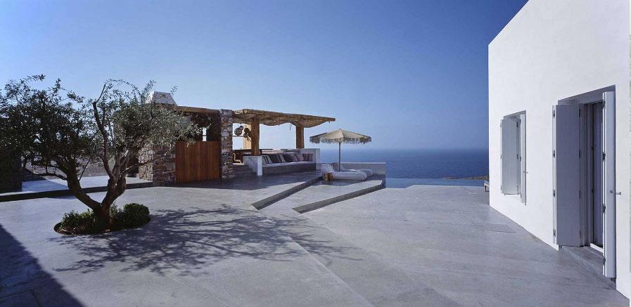 El proceso de diseño estuvo marcado por las características orográficas de la zona, así una gran escalera conduce desde la parte alta de la vivienda hasta a la propia entrada, que está a un nivel más bajo. Al final de este camino descendiente, se abren las impresionantes vistas hacia el mar Egeo.