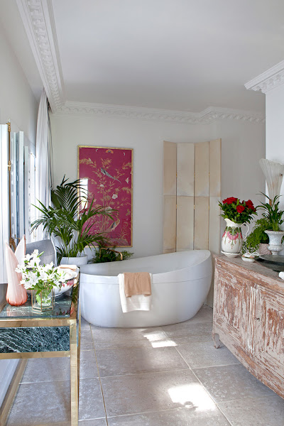 Como siempre Beatriz Silveira y defraudó creando una estancia de salón, suite con baño incorporado. Pero lo que más me gusto es la parte del baño, bañera Villeroy & Boch y un mobiliario mezclando piezas antiguas con una mesa de mármol verde y oro, elegancia en estado puro.