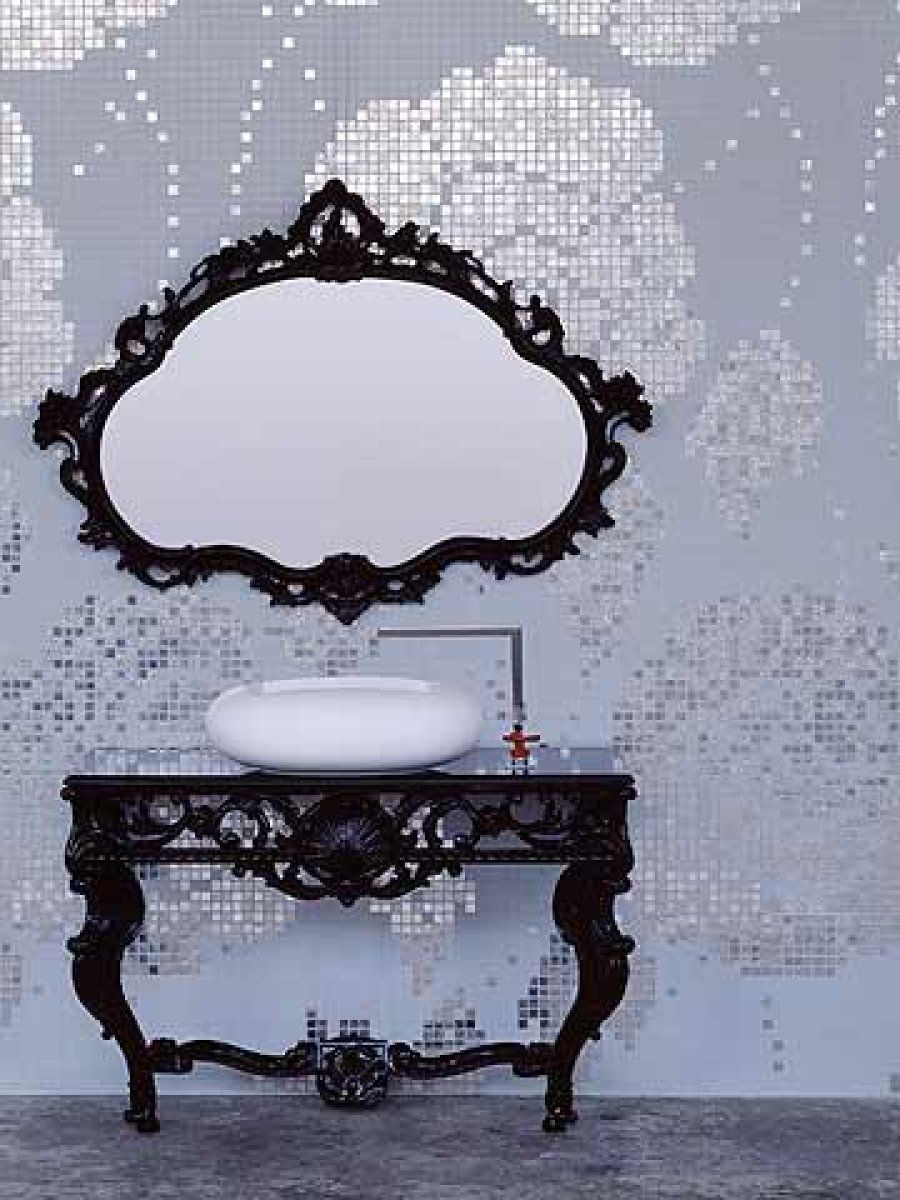 Sobre el mismo diseño, esta vez combinando el Vetricolor con el mosaico de vidrio Oro, se apoya una consola con lavabo y un espejo, ambos de inspiración neobarroca. Marcel Wanders firma esta estancia para Bisazza. Este ambiente pertenece a un proyecto llamado ‘Soap Stars’ en la que el bienestar marca las pautas.