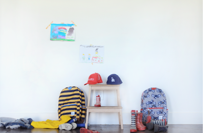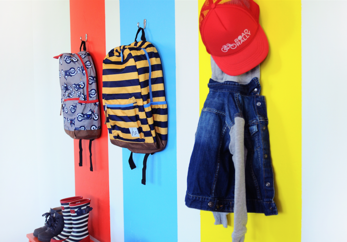 En la foto final, observamos como una vez colocados los taburetes en las rayas de la pared se han colocado unos sencillos ganchos para colgar la ropa, a la altura de los niños. Así vemos, como tanto el calzado, la ropa y las mochilas están ordenadas.