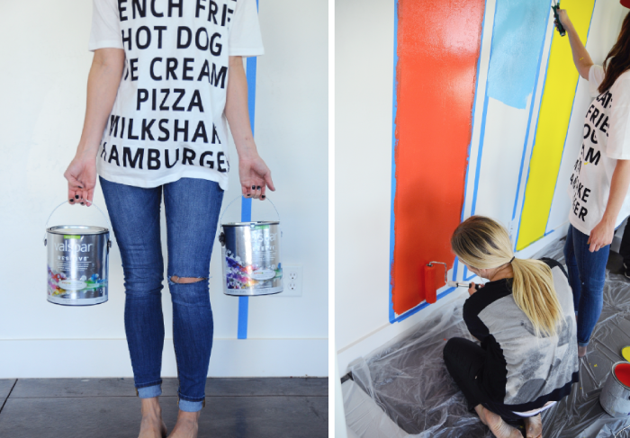 En la foto del durante, vemos como las madres encintan unos rayas anchas en la pared y aplican la pintura de los tres colores primarios; amarillo, rojo y azul.Con la misma pintura pintan en color tres taburetes/escalera de Ikea.
