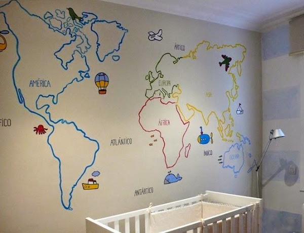Las tendencias en decoración de paredes, una de ellas es hacer un mapamundi enorme en la pared donde nuestro peque pueda ver los diferentes países, continentes, monumentos... Javier de Muraldecoracion.com nos muestra uno de sus últimos trabajos que nos encanta para un cuarto infantil moderno, además es completamente unisex.