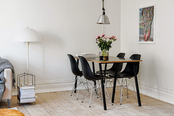 Apartamento de 68 m2. De un dormitorio, un baño, cocina y salón-comedor y una coqueta terracita.Una mezcla de estilos minimalista, ecléctico y nórdico. Las características más destacadas de este apartamento, paredes blancas, suelo de madera de haya, decoración a todo color con algunas piezas de diseño, lamparas de estilo industrial y un baño con tuberías a la vista. Pero todo organizado!