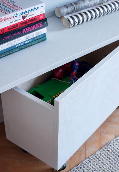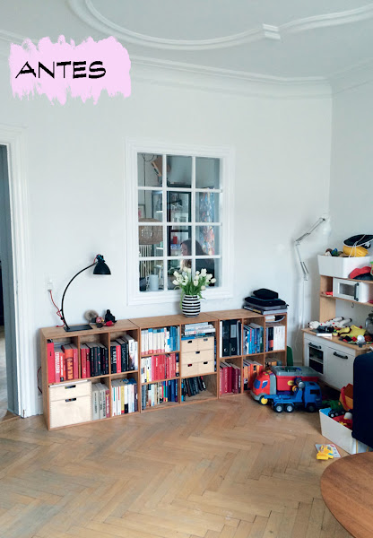 El proyecto que os traigo hoy es sencillísimo de hacer y eficaz para combatir el desorden en el salón. Una combinación de baldas y escuadras, que podéis hacer vosotros mismos, cubriendo toda una pared de una estancia, ha dado lugar a una habitación ordenada con mucho espacio para libros y objetos, baúles para juguetes e incluso un rincón de lectura.