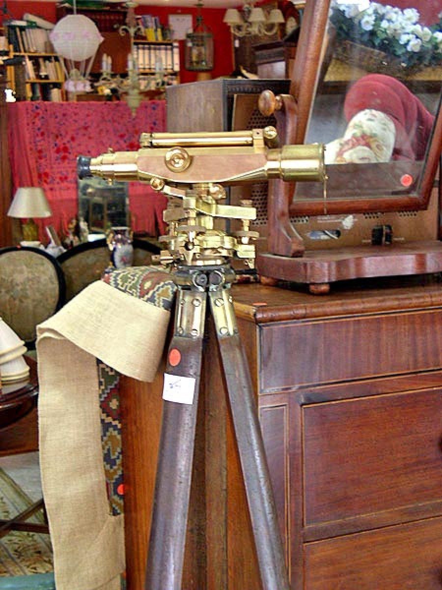 Teodolito inglés de principios del siglo XX, marca Stanley, en bronce con trípode de madera. Precio: 480 €.