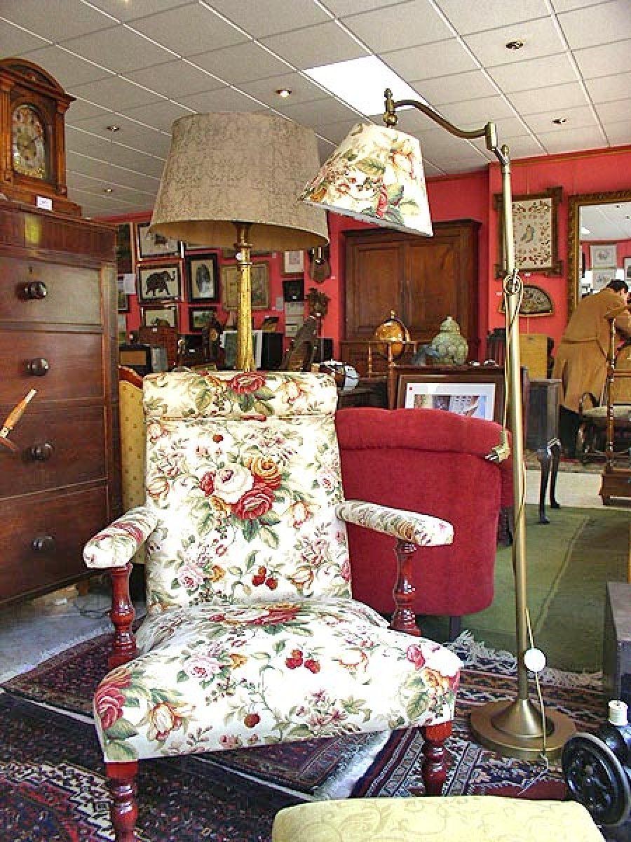 Original butaca tapizada en una cretona de flores a juego con la pantalla de la lámpara.