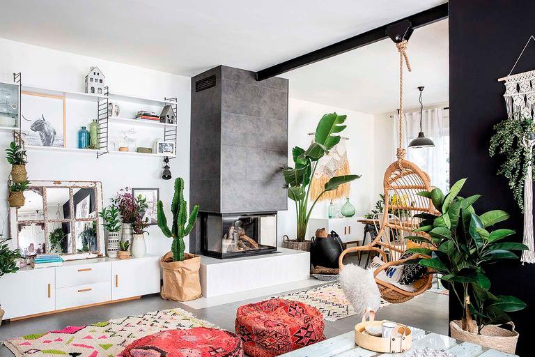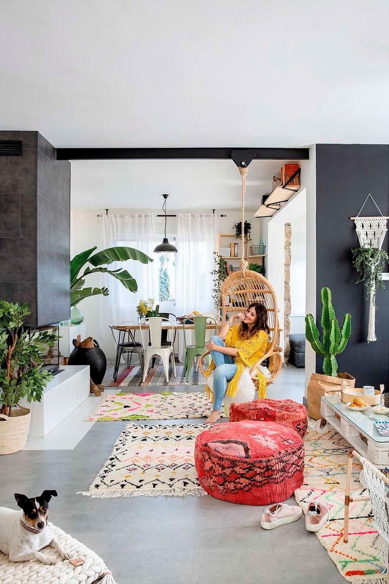 A continuación, encontramos una zona de chimenea. Ya existía en la casa cuando la compraron, pero la tunearon para darle un aire más moderno. En la parte superior se colocó un material que imita a piedra y en la inferior un porcelánico para no tener problemas con las brasas que pudieran saltar a la madera. Se les ocurrió también instalar una viga para hacer de soporte al sillón colgante de la firma Vackart y se rodeó de coloridas alfombras y pufs de Kenza and Co.