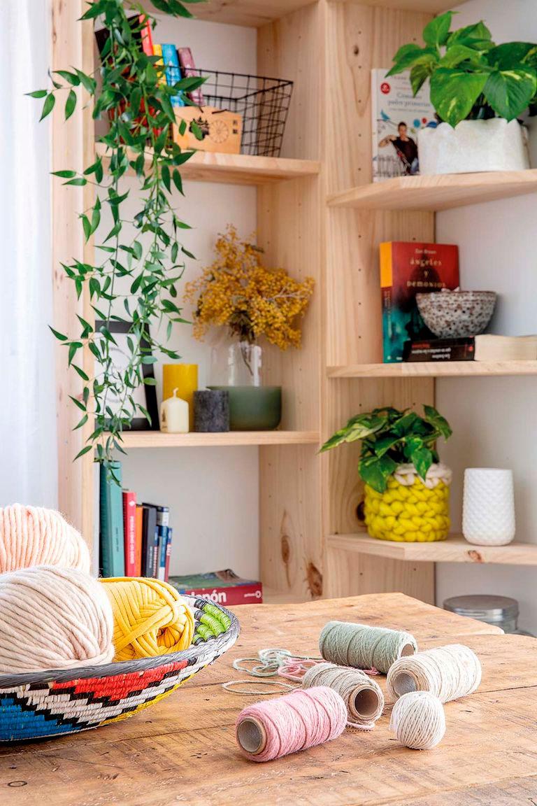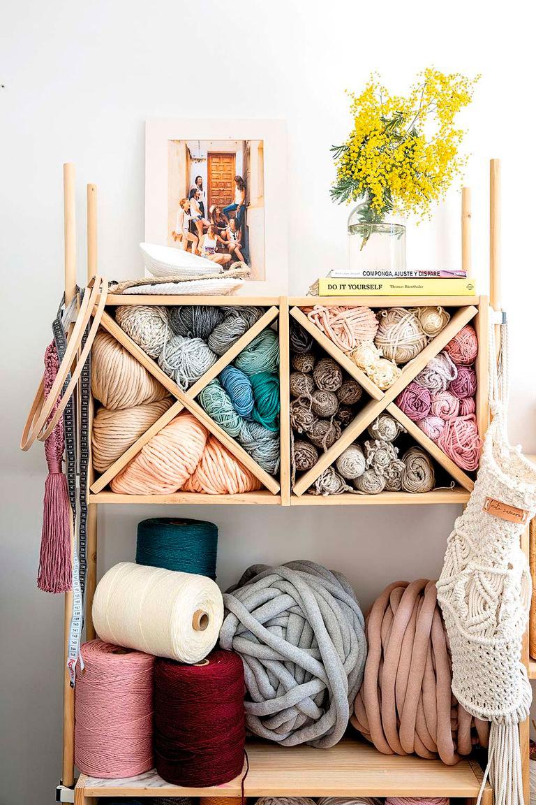 Además de los dormitorios, en otra de las habitaciones la propietaria montó su taller. Cómo me gusta cualquier sitio inundado de materiales que tengan que ver con cualquier disciplina artística, me da igual que sea como en este caso, lanas, o talleres llenos de pintura, o cerámicas, maderas,… cada vez que veo un taller, se dispara mi creatividad. En este caso, las estanterías tan bonitas que albergan todos sus materiales pertenecen a la firma Astigarraga Kite Line.