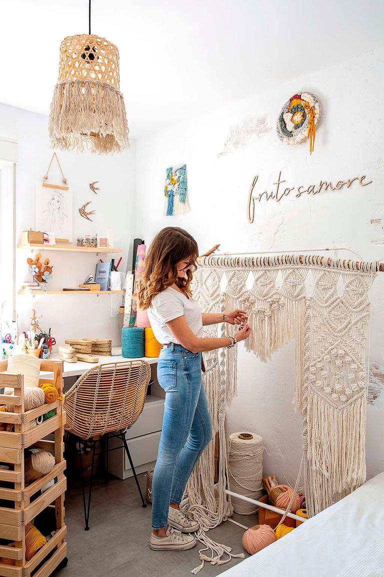 Esta es la historia de Sara Moreno, una mujer que hasta su maternidad trabajaba como administrativa pero que, con la llegada de su hijo, decidió buscar un nuevo camino para conciliar. Sara convirtió su pasión en empresa, desde niña le habían gustado las manualidades y el bricolaje, así que poco a poco fue creando lo que hoy es Fruto Samore. Comenzó con grandes mantas de lana merina y hoy hace increíbles tapices que, incluso le encargan como altares de boda. También da cursos y talleres presenciales.