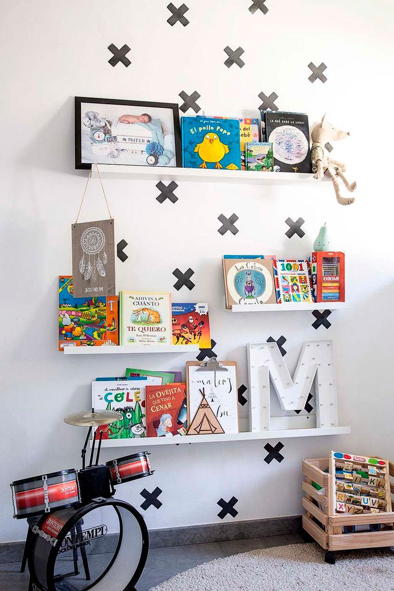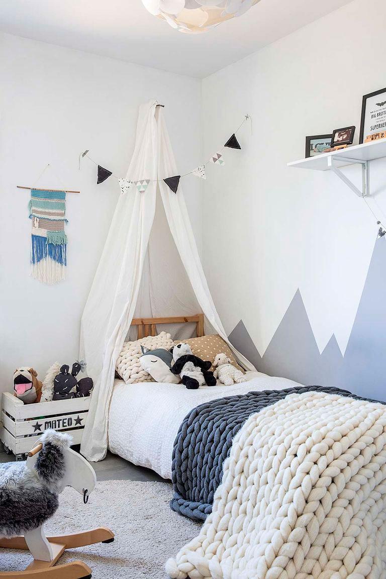Igualmente, el dormitorio infantil es un puro DIY. Las mantas son fruto de la firma de la propietaria, la cama y la alfombra son de Ikea, para el juguetero se ha utilizado una caja de madera reciclada y pintada, la decoración de las paredes se ha resuelto por un lado con pintura (haciendo forma de montañas) y en la zona de lectura, simples cruces que pueden hacerse fijándose a la pared con cinta aislante negra.