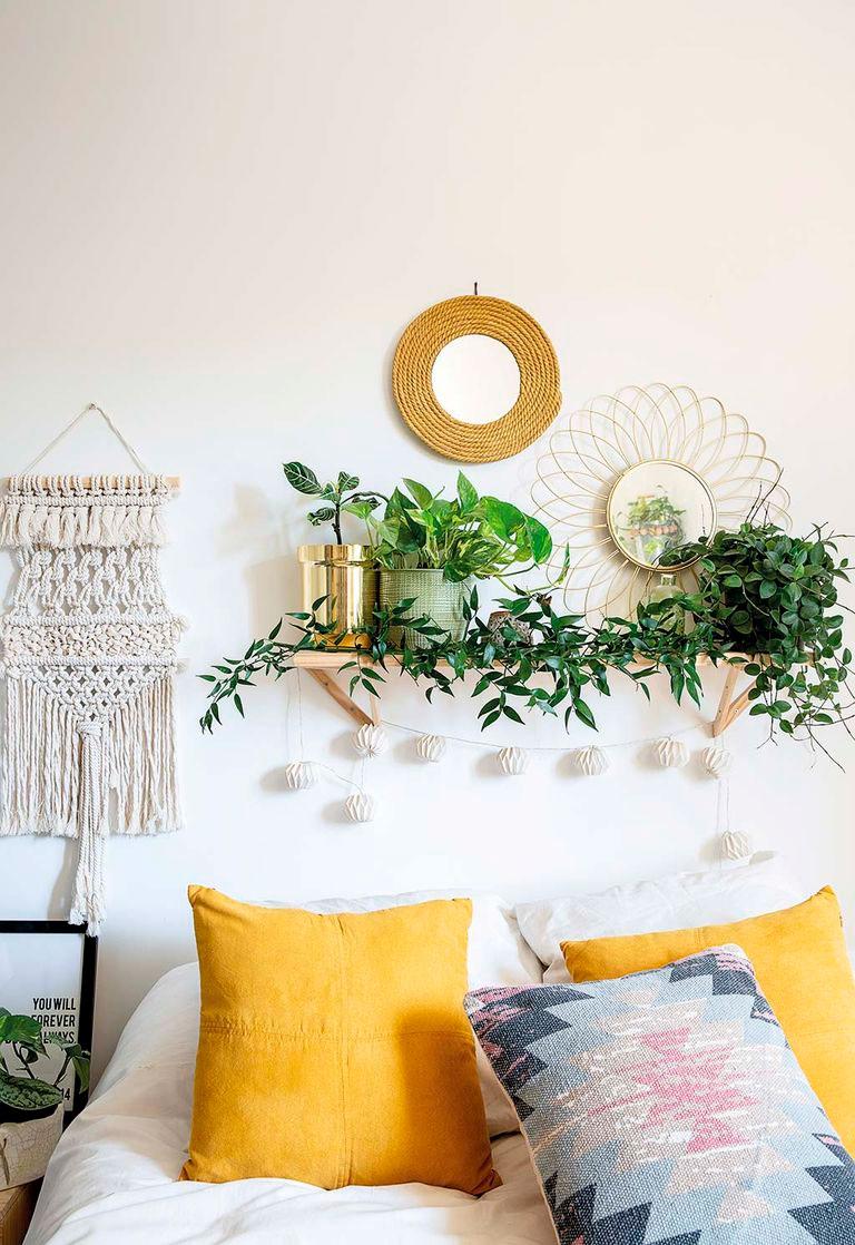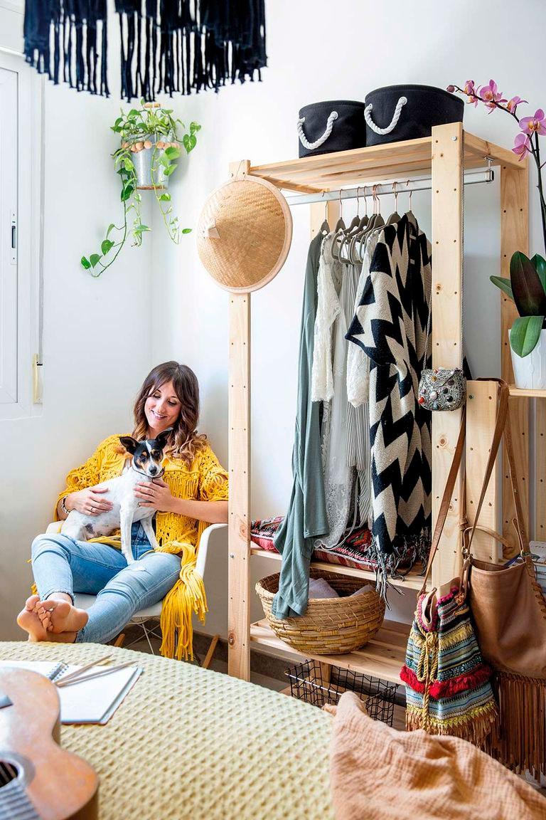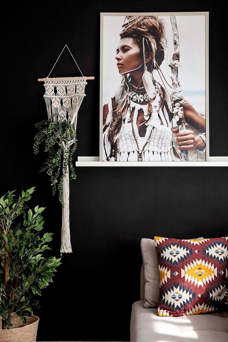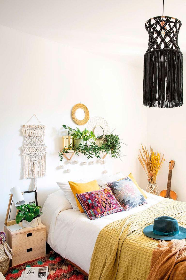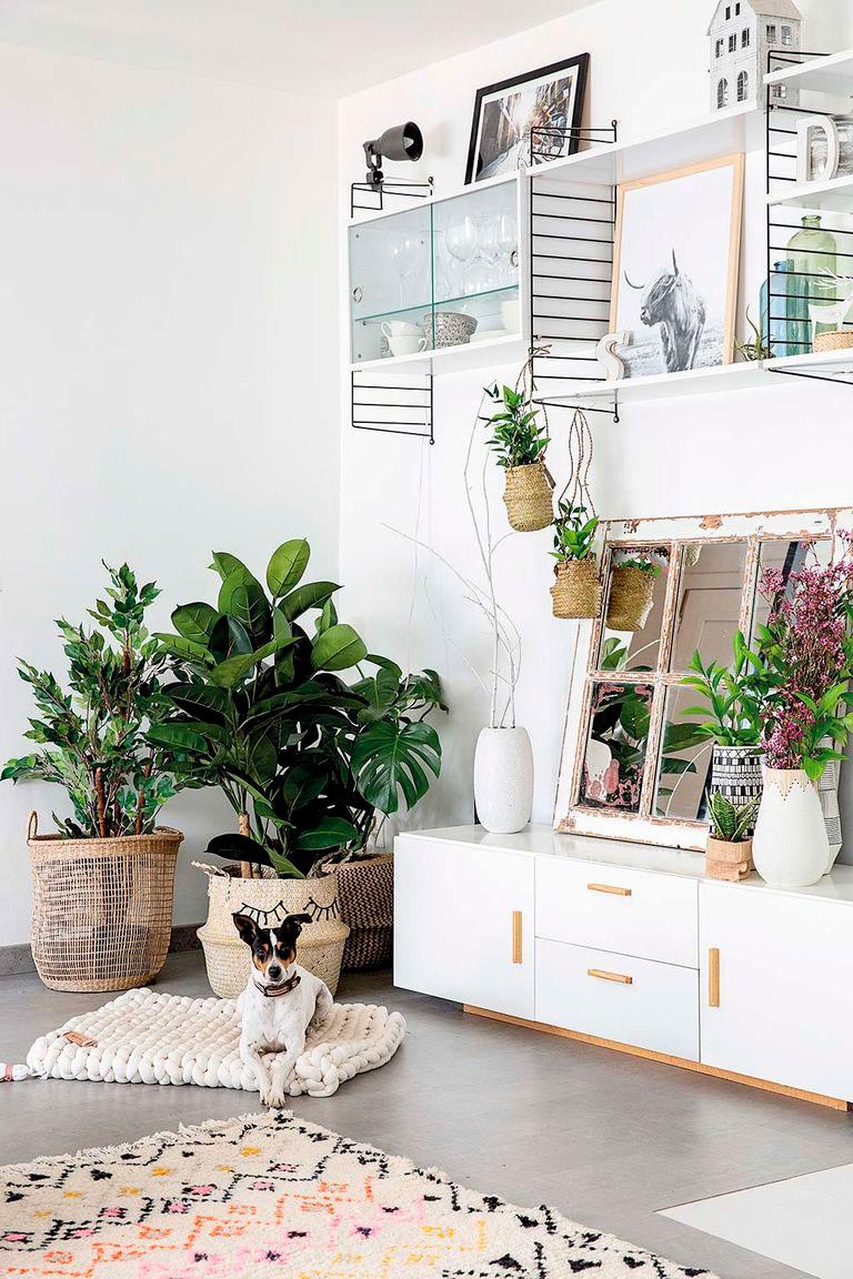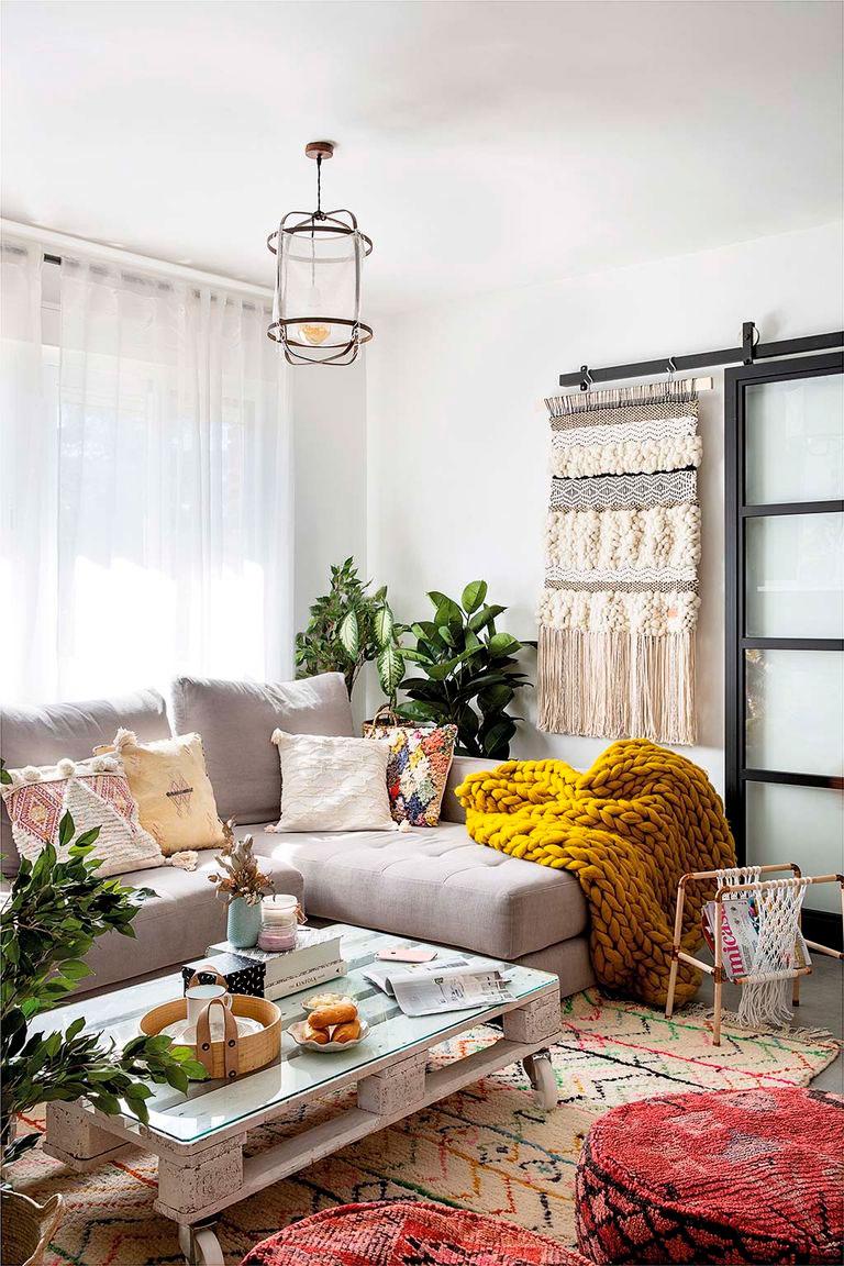 Lo que vamos a ver hoy es su casa. Una vivienda donde no existe la mano de un interiorista, donde todo lo que veis sale de la mente privilegiada de su dueña. Hay piezas compradas, claro, pero mucho DIY también (como la mesa de comedor), por supuesto macramé que adorna paredes, mantas envolventes, lámparas, cojines, pufs, cestos, incluso la camita del perro que está tejida por sus manos. Otra de las cosas que no falta en esta casa, son las plantas, hay tantas que en algunos sitios ha tenido que introducir artificiales, no le da la vida para tanto riego.