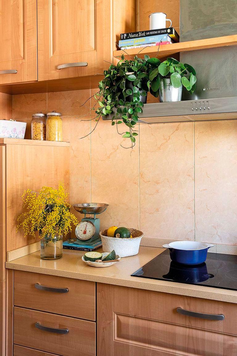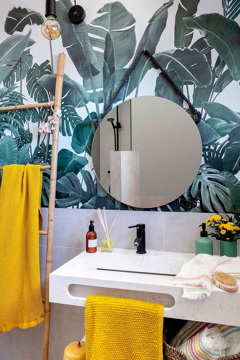Toda la casa la van reformando los propietarios poco a poco, de habitación en habitación, gracias a sus habilidades y a la ayuda de otros miembros de la familia. En el baño, por ejemplo, querían darle un toque verde, pero tanta planta ya era demasiado, así que recurrieron a los vinilos de Lokoloko, resistentes a las zonas de agua y que además aportaban profundidad a la pared. El lavabo de piedra con toallero incorporado y el espejo, son de Leroy Merlin, las toallas de Zara Home.