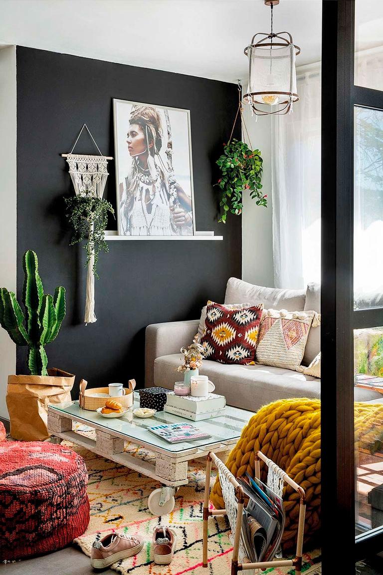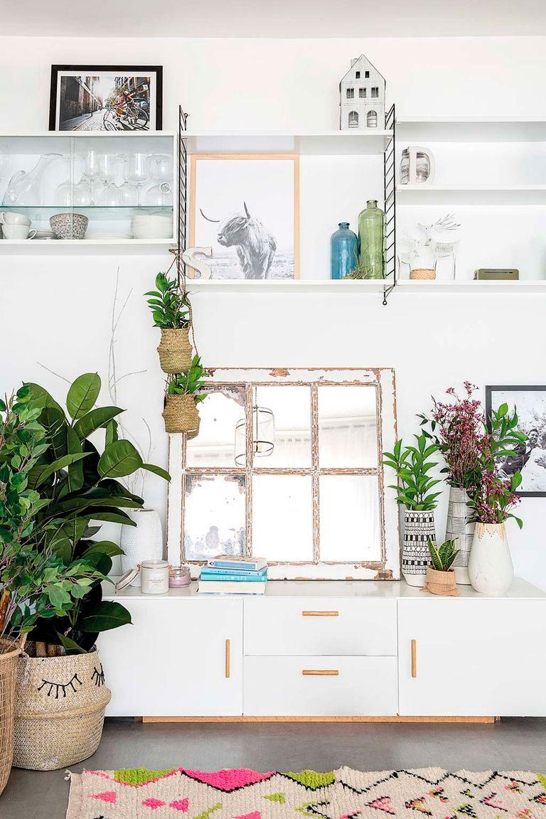 Tras la chimenea, se encuentra la zona de estar. Para hacerla más acogedora se pintó la pared junto al sofá Manacor de Fama, en un color oscuro. En este rincón podemos ver tanto las mantas de lana merina, como tapices de Fruto Samore, cojines de Kenza and Co y Zara Home, o una mesa de centro fabricada con pallets (también de Fruto Samore). Frente al sofá, una mezcla de piezas, como la famosa estantería String, una de sus piezas favoritas, o sobre el mueble, su última adquisición comprada de segunda mano en Wallapop, un espejo tipo ventana antiguo. Por supuesto, todo el espacio está rodeado de plantas.