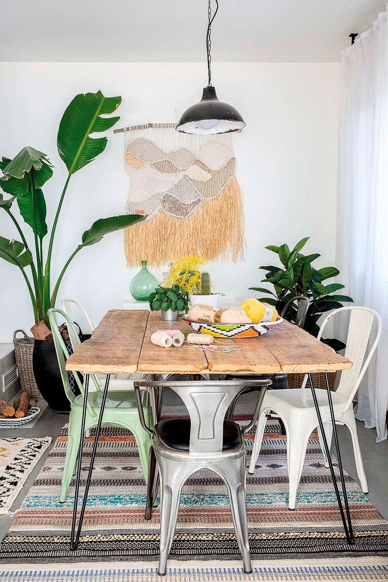 El salón mide nada más y nada menos que 50 metros cuadrados, así que para hacerlo más acogedor se ha dividido en varios ambientes. Al fondo el comedor con mesa realizada por los propietarios y sillas de Leroy Merlin tipo Tolix, el macramé que adorna la pared es su firma, Fruto Samore.