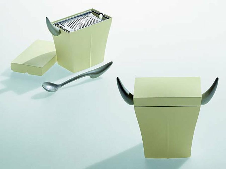 Uno de los juegos favoritos de este diseñador es el de las apariencias. Sirva este conjunto de quesera con rallador llamado Mister Meumeu de ejemplo. El cuerpo de este artilugio desenfadado está fabricado en plástico de calidad, mientras que el mango y la cuchara son de metacrilato.