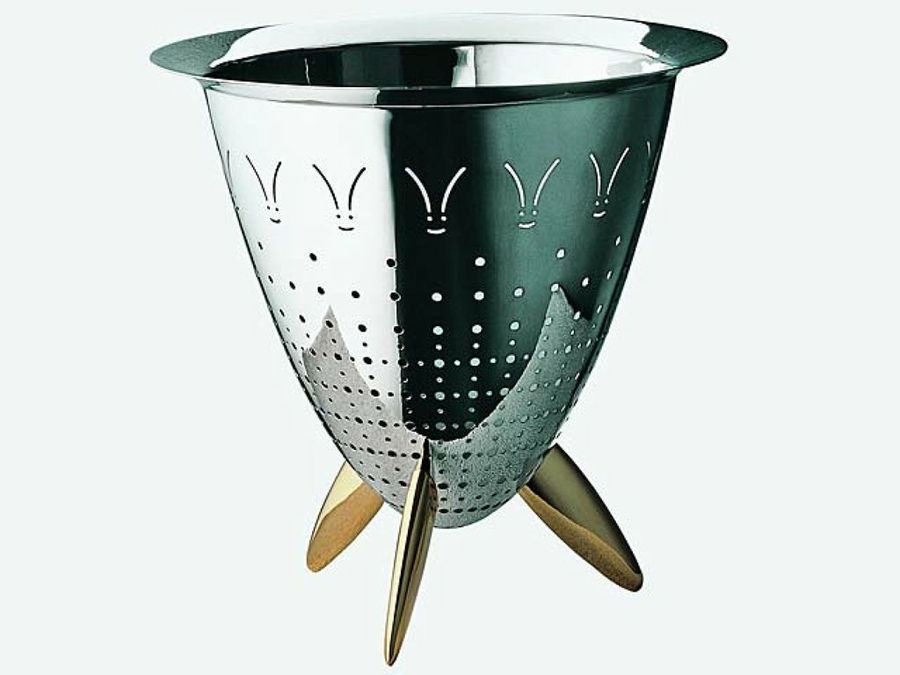 Otro de los productos exclusivos distribuidos por la compañía italiana es el escurridero Max le chinois. Los motivos que desempeñan la función atribuida a este utensilio se salen de lo estrictamente convencional. Su forma se apoya en unos pies dorados de latón que tampoco obedecen a los cánones cotidianos.