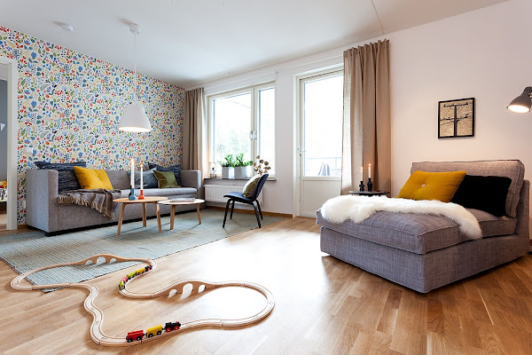 Por lo general la decoración de estilo nórdico se base en la utilización de color neutros y mobiliario sencillo y práctico. Los colores como el blanco y el gris, suelen ser los reyes de esta decoración, al igual que los muebles de madera natural o los lacados en blanco. El piso de hoy tiene todas estas características en cuanto a colores y muebles prácticos y funcionales, pero también tiene muchos toques de color y una gran variación de patrones.