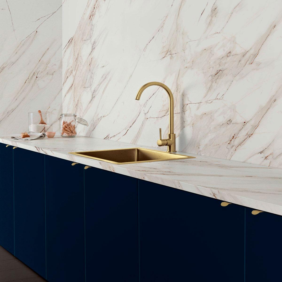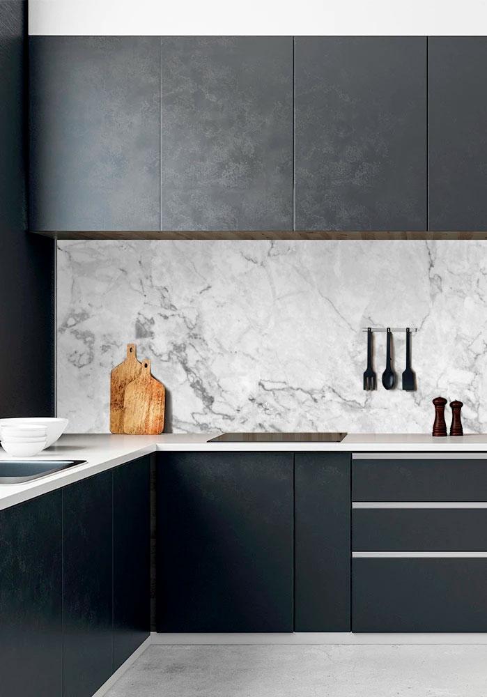 Increíble esta cocina, los armarios están forrados con vinilo azul y tanto la encimera como el frente, es vinilo que imita al mármol ¿Cómo te quedas?
