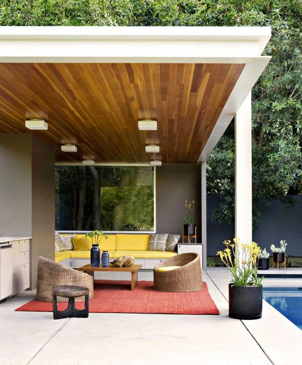 Aunque también pueden ser totalmente abiertos como en la imagen de arriba, donde se han colocado unos sillones con colchonetas y cojines a rayas.