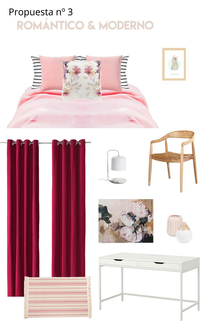 Como tercera opción, incluimos variaciones de color rosa para mantener el aire de romanticismo de la alternativa anterior. En cambio, recurrimos a piezas de diseño actual para adecuarlo más a la edad de la clienta.