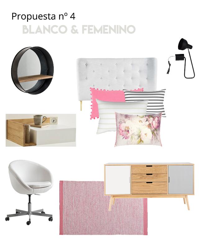Siguiendo en esta línea, la última opción es más funcional y moderna. Aquí el blanco, la madera y el negro son los protagonistas, dejando el rosa para los accesorios.