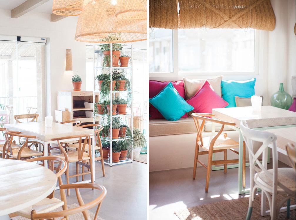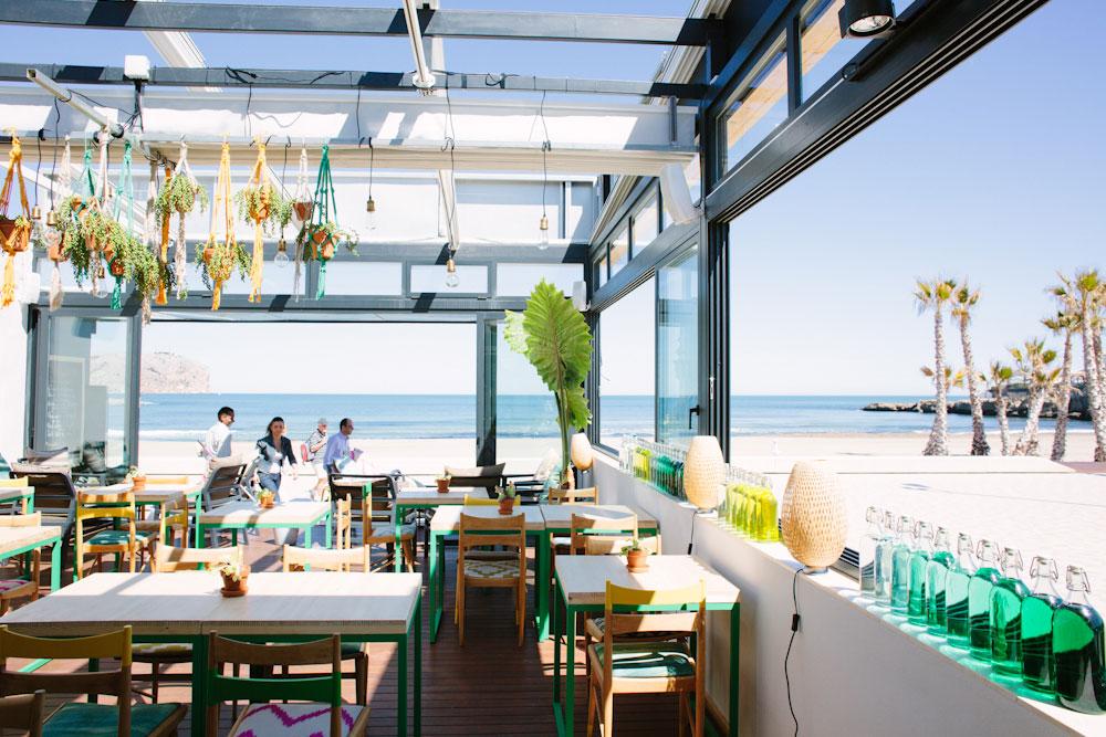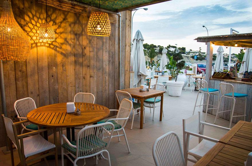 1.- Cala Bandida: Directamente situado en el puerto de Javea. Los llamativos colores hacen referencia al entorno, desde el mar, la naturaleza, e incluso a los edificios de la zona. Mucho mimbre, plantas, las clásicas sillas Wishbone con las patas pintadas, alguna Thonet en color natural, paredes recubiertas con contraventanas mallorquinas, lavamanos en piedra natural, etc. todo recuerda al Mediterráneo.