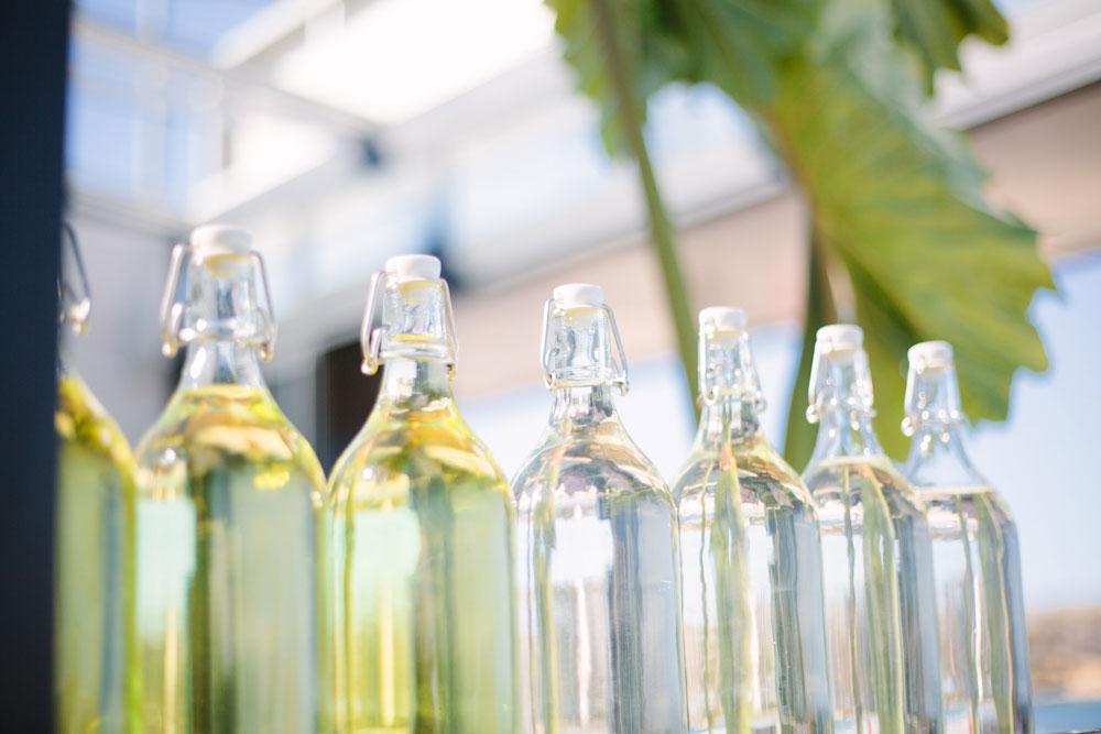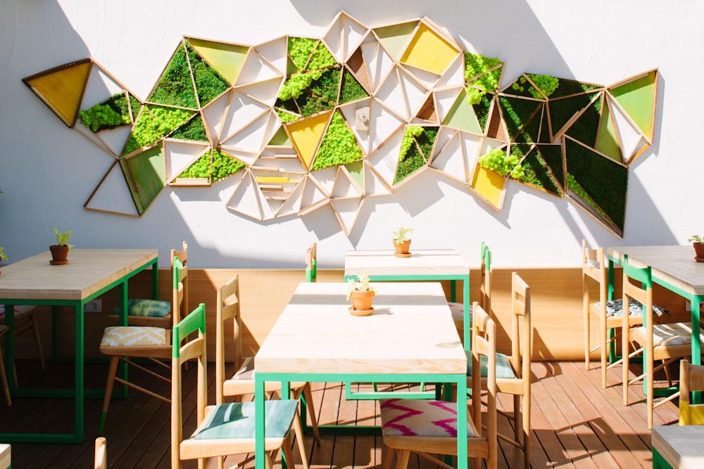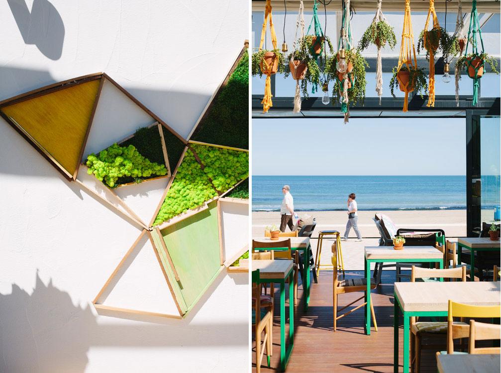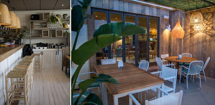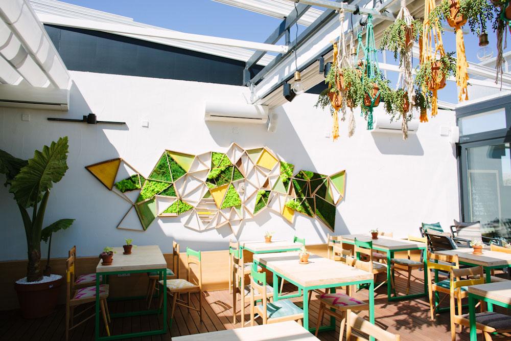 2.- Blancos y Tintos: De nuevo seguimos en la playa, frente al mar. Un chiringuito donde conviven los alimentos orgánicos, el vino y las referencias botánicas. A la madera y al hierro, se les ha unido el cristal (un guiño a las botellas de vino). Tampoco falta la vegetación en forma de jardín vertical y en composiciones de plantas colgadas en cestos de macramé. Una decoración inspirada en el menú saludable de “Blancos y Tintos” y también en el entorno.