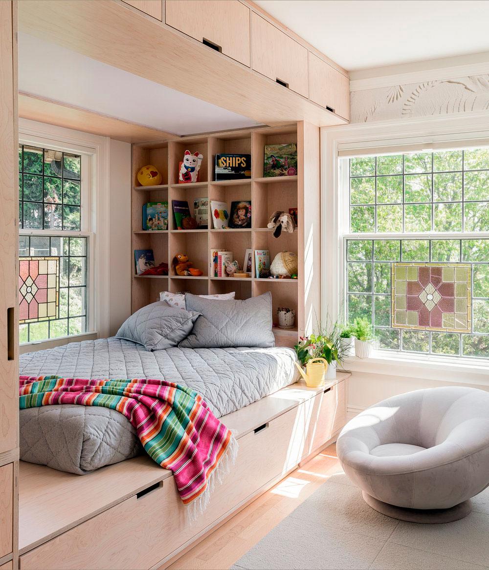 Los dormitorios están llenos de soluciones de almacenaje, zonas para trabajar, librerías,… lo cierto es que el tamaño también ayuda. Me ha encantado la idea de una cama de matrimonio central con la librería detrás y zona de trabajo bajo la ventana, pocas veces lo he visto (muchas con un vestidor, casi nunca con una librería).