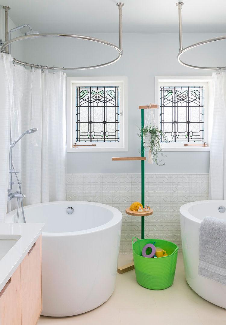 Cada habitación tiene su baño propio, el principal con una bañera profunda de madera, zona de relax y azulejos blancos con textura. Un segundo baño, muy original por cierto, tiene dos bañeras circulares y profundas también, enmarcadas bajo dos vidrieras y en el centro, un cuelga plantas que a su vez sirve de apoyo o pequeña estantería.
