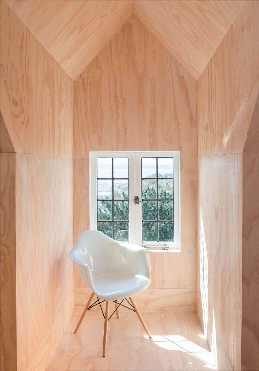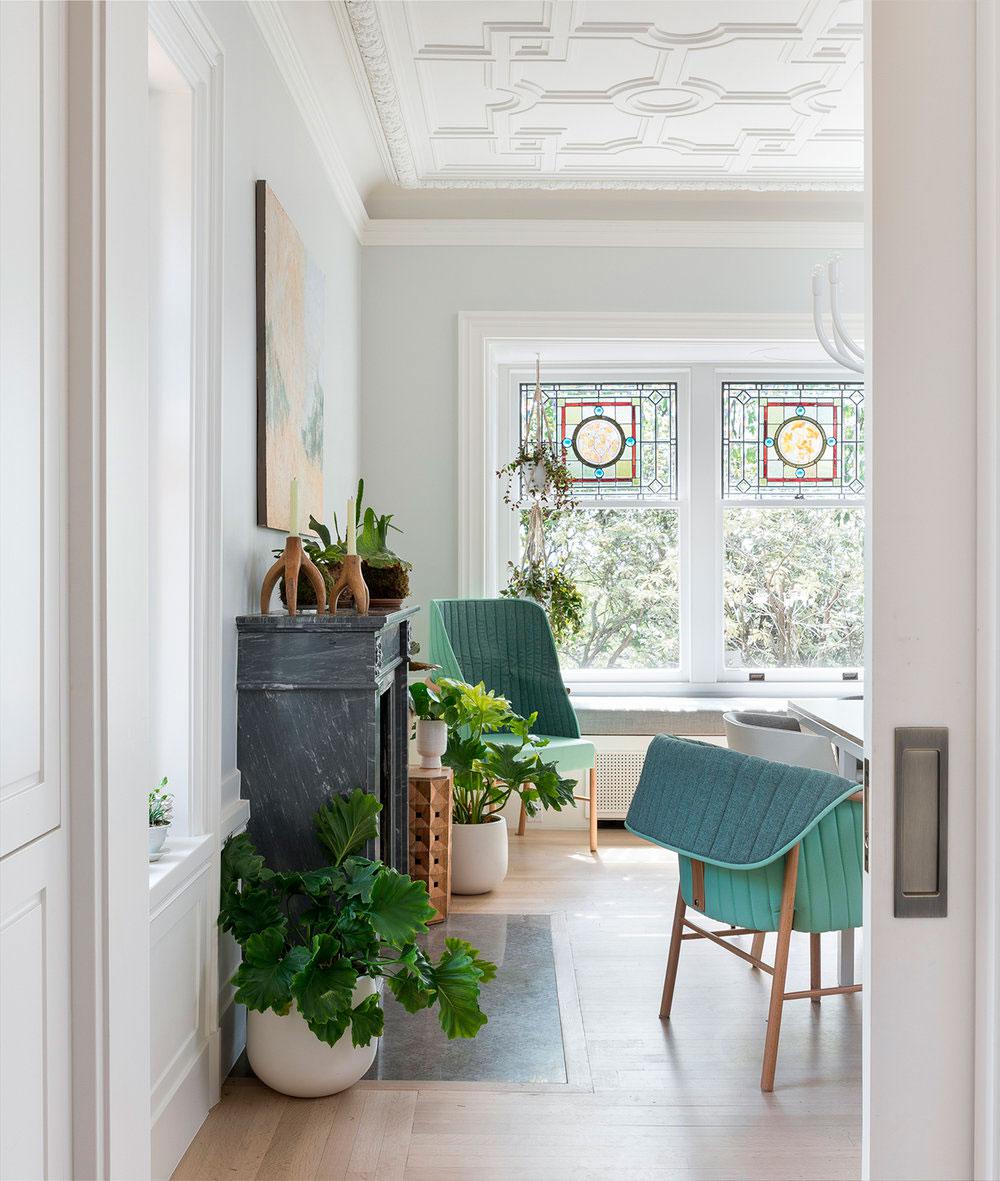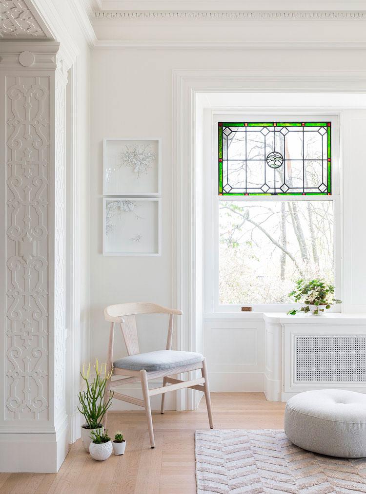 Ya en el interior, se han respetado los suelos de madera y las carpinterías antiguas, pero se han pintado de blanco para aumentar la sensación de amplitud, incluidas puertas correderas, columnas de madera tallada o la barandilla de la escalera. El toque de color y la guinda del pastel de esta vivienda, al menos en mi opinión, son las vidrieras. De ahí que el mobiliario, sea en su mayoría en tonos neutros. Podemos ver también cómo en muchas ventanas se han añadido butacas, sillas o bancos, para poder disfrutar de las vistas del jardín, que por cierto, tampoco tiene desperdicio.