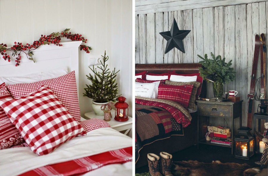 Algunos detalles verdes como los de las imágenes le dan un aspecto campestre y folk a cualquier dormitorio. Pequeños arbolillos de navidad, hojas de acebo con frutos rojos… el verde y el rojo son los colores de la navidad más tradicional. Juega con ellos para imprimir ese carácter festivo a tu hogar.
