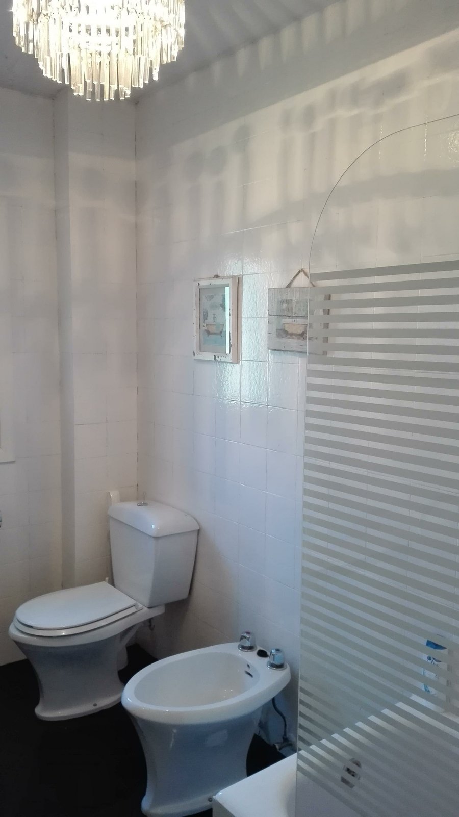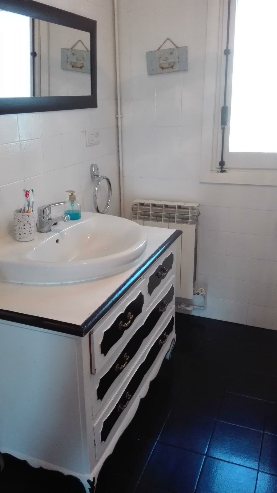 Un par de manos de pintura a las baldosas de la pared en blanco (20€), otro par en negro y una de barniz al suelo(10€) , pintar el marco de la ventana, una cómoda de segunda mano por 8 € y una mampara de bañera por apenas 15€....