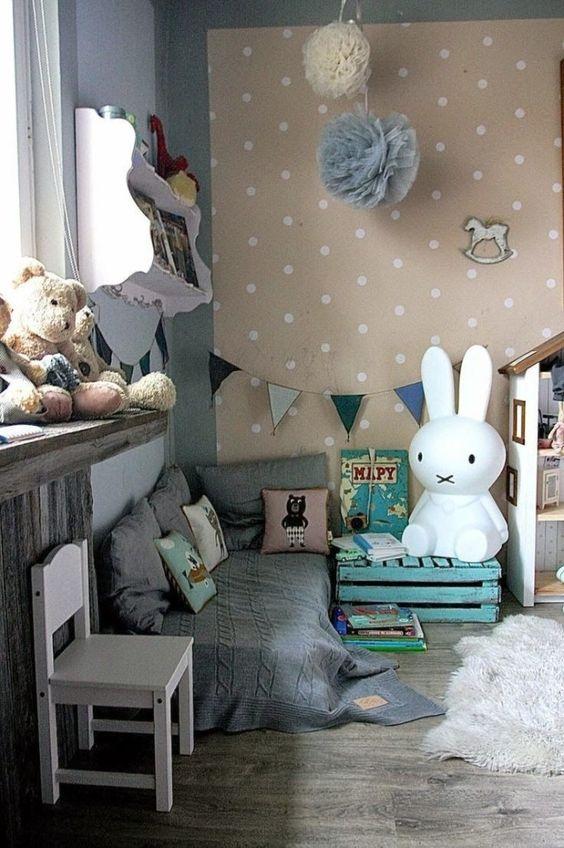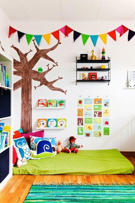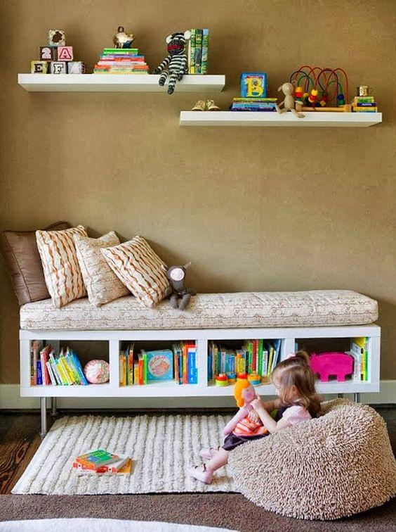 Aquí hay que echarle un poco de imaginación para crear un espacio que motive al niño y le invite a leer. En primer lugar, debemos escoger siempre un lugar que tenga buena luz natural. Es importante también colocar estanterías a su altura o cajas de plástico, madera… mejor si están provistas de ruedas, para que los libros estén a su alcance y, además de cogerlos para leer cuando le apetezca, se acostumbre desde el primer momento a dejarlos en su sitio cuando termine.